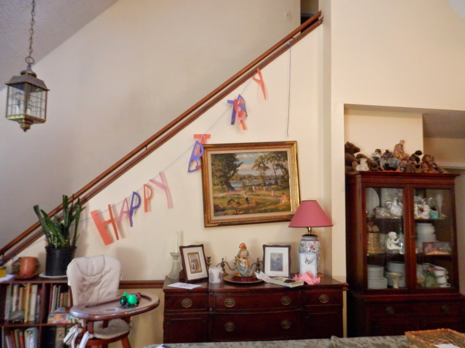 promise he had definitely not flung his leg over the rail. I submit the following picture of my crooking painting and Happy BT R Y sign into evidence (not to mention the testimony of his father and siblings who found him hanging on for dear life).