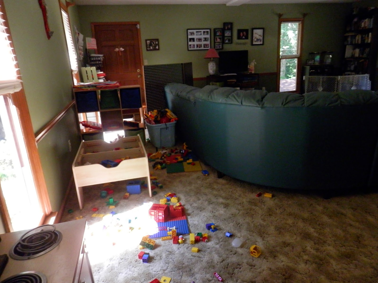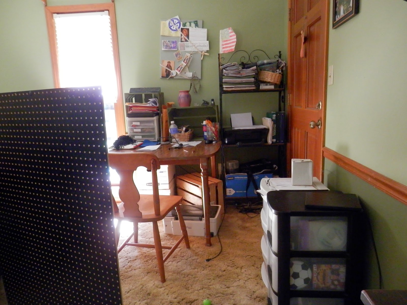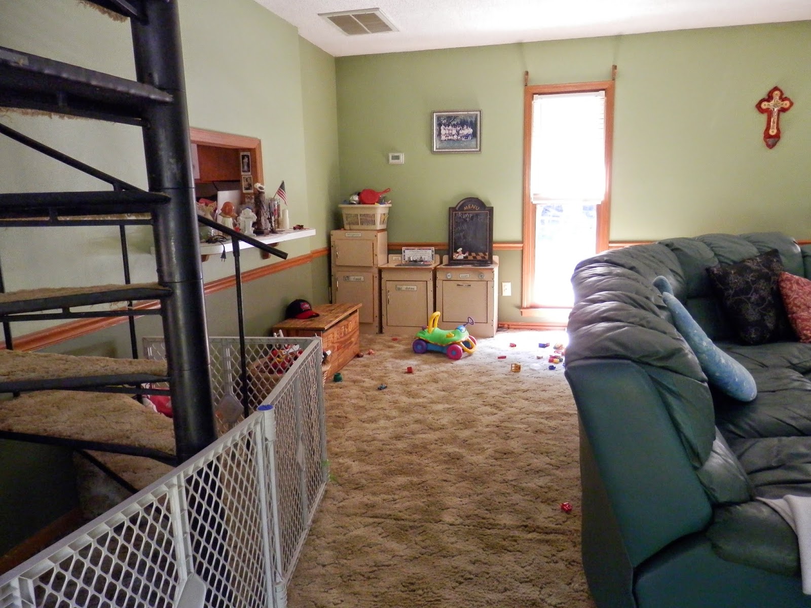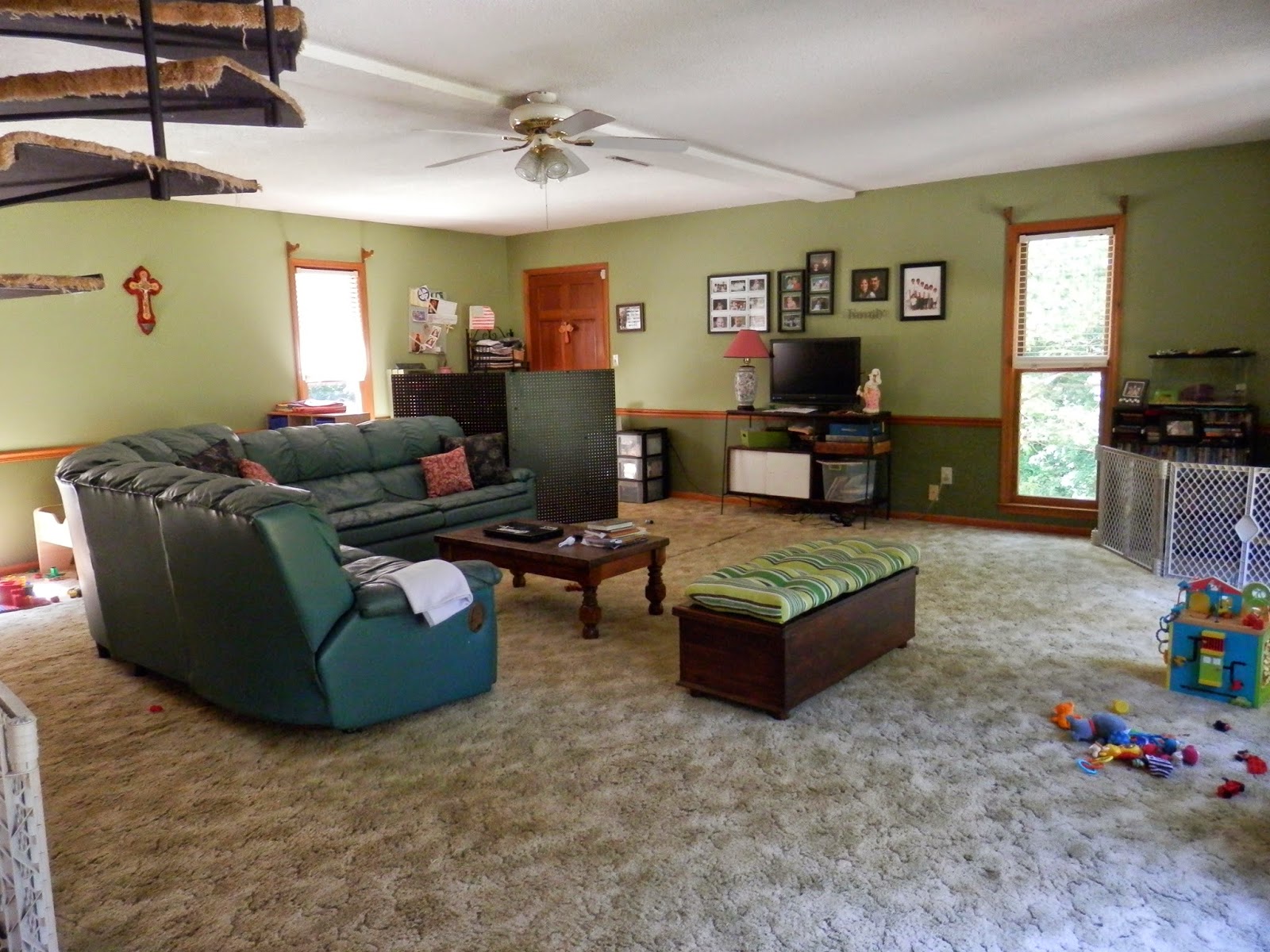 Our family room is one giant space which houses an office, a playroom, and an entertainment area. The space needs to be both comfortable and functional. As NFP teachers, we also use the space to host classes so I’d rather that the playroom portion not overrun the whole room. Using furniture placement and a little creativity, I think I’ve achieved my goal.