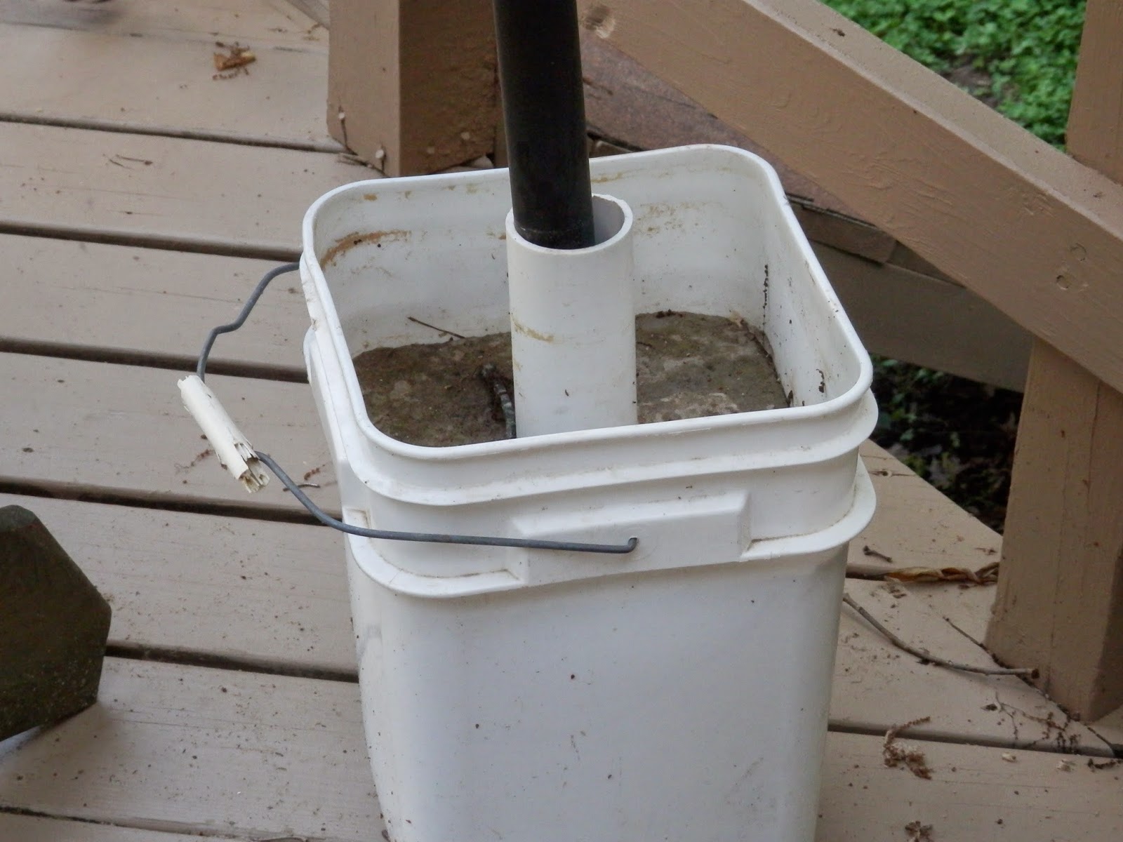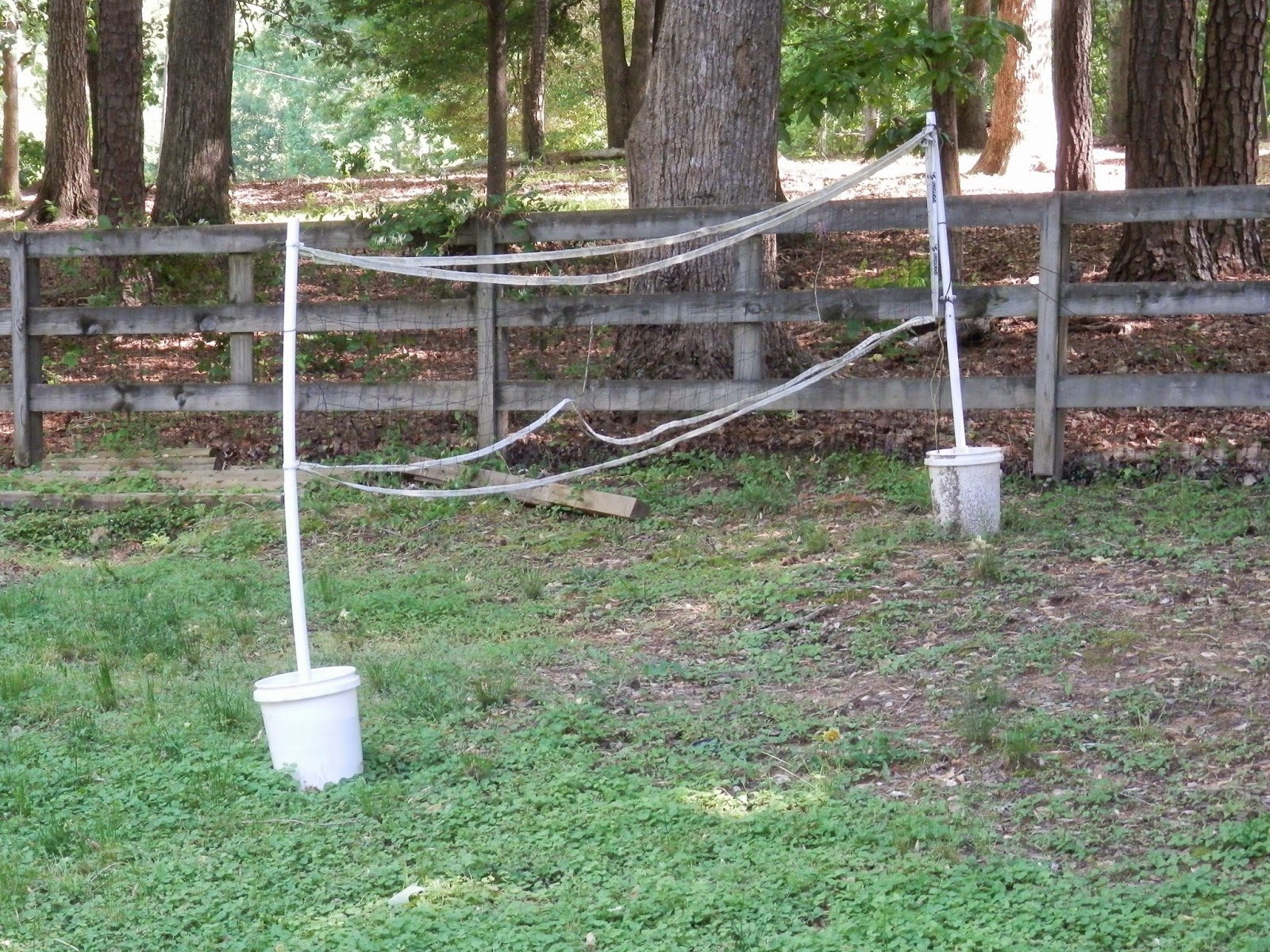 We have a badminton net that has been relocated at least half a dozen times. The tie-downs it came with have long ago disintegrated and who knows where the metal anchor pins ended up. Since I am all about being frugal and making things last a LOOOONNNGGGG time, I asked my handy hubby to make something more permanent but also easily movable. With a few 5 gallon buckets (we own more of those than any normal person needs), pieces of PVC pipe and a bag of cement, he created these great stands for our nets and our porch umbrella. They are heavy, but that keeps them firmly planted upright and they aren’t so heavy that the big people around here can’t move them when necessary.