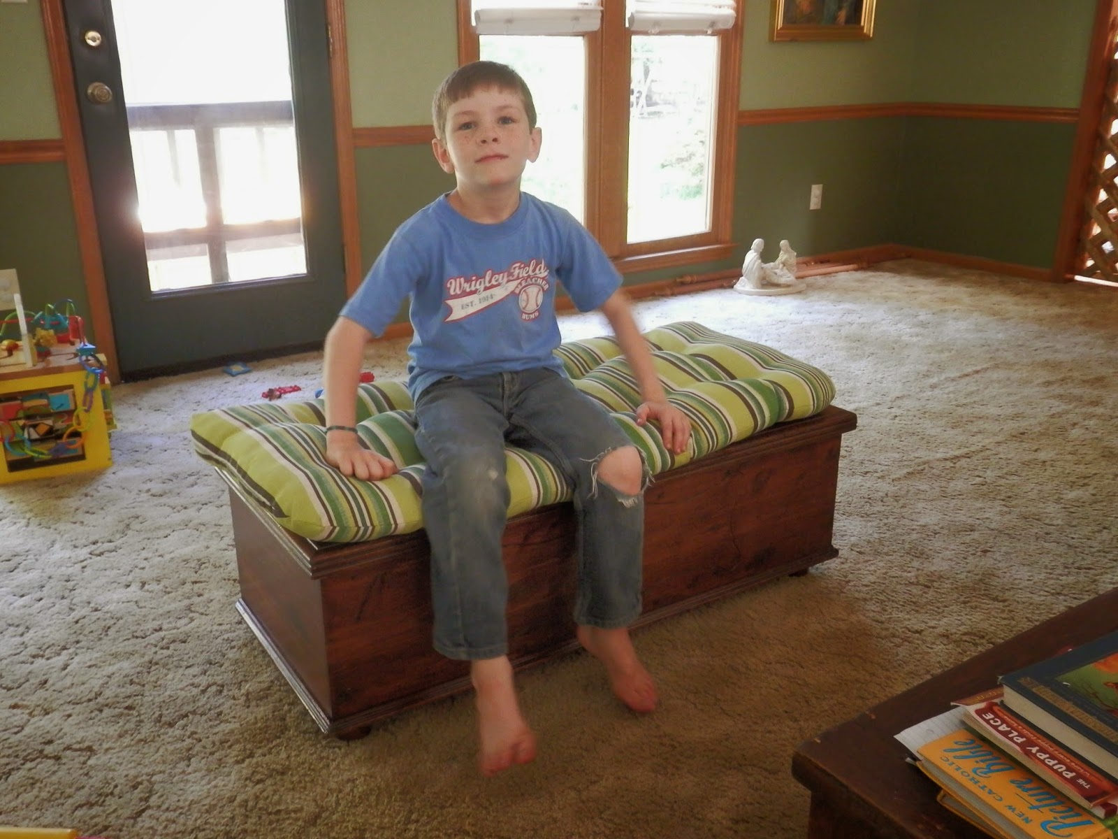 This seemed like a no-brainer, but it took me a few years to give this hope chest a second job. I really don’t like have too much furniture, so the items that make the cut generally serve more than one purpose. Mr. B and I bought this hope chest (used) pre-kids and it has faithfully held our extra blankets and stuff for years. When I was rearranging the family room recently (rearranging/swapping furniture is a cheap way to renew your space every few years), I decided we needed an extra spot to plant little “seats.” I touched up the finish on the old chest, added a cushion and here ya go.
